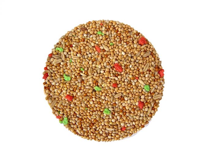 Yellow/red/white millet, canary seed, niger, red/green bisquit, oats with vitamins