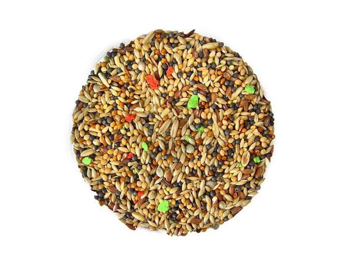 Canary seed, dark turnip rape, yellow/red millet, linseed, oats, hamp seed, wild seed