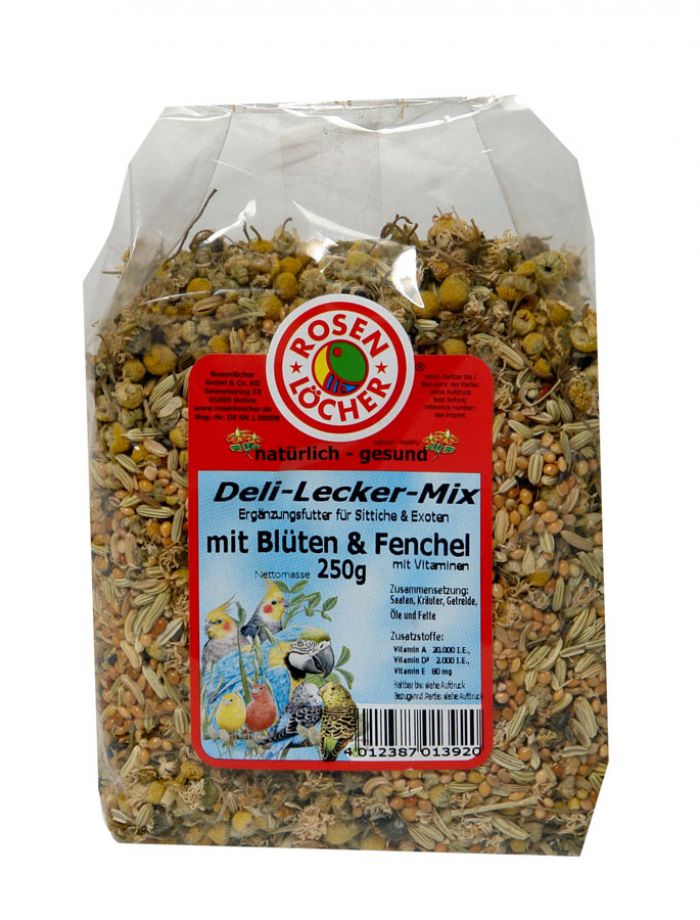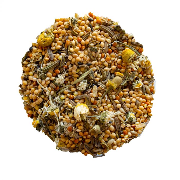 Yellow/red millet, fennel, niger, daisy flowers, camomile flowers, canary seed, oats with vitamins