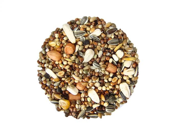 striped/white sunflower, red milo, wheat, white dari, safflower, hemp seed, buckwheat, corn, oats, peeled peanuts, linseed