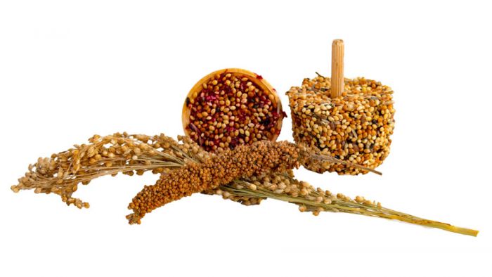 millet spray, proso millet, nibble mushroom, waffle cup (with linseed, canary seed, oats, beetroot,apricots, parsley)