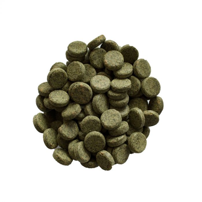 Gemüse, Getreide, pfl.Nebenerz., Algen (20% Spirulina), Hefen, pfl. Proteinextrakte,Krebstiere