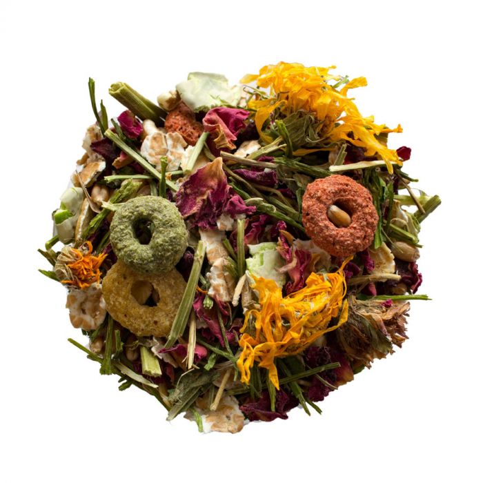 Weizen, Alfalfa Heu, Erbsenflocken, Weizenflocken, Ringos Natur (Extrudat aus Mais,Maiskeim, Luzerne, Sonnenblumenöl, rote Beete), Petersilienstiele, Rosenblütenblätter, Puffweizen, Rote Beete-Würfel, Haferflocken, Pfefferminzblätter, Rotkleeblüten, Ringelblumenblüten, Haferkerne mit Vitaminen