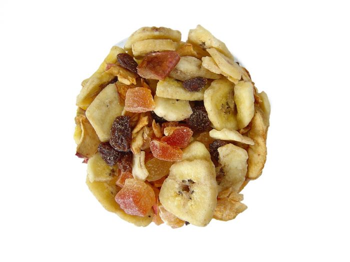 Bananenchips, Papayawürfel, Rosinen, Apfelwürfel, Ananasstücke, Mangowürfel