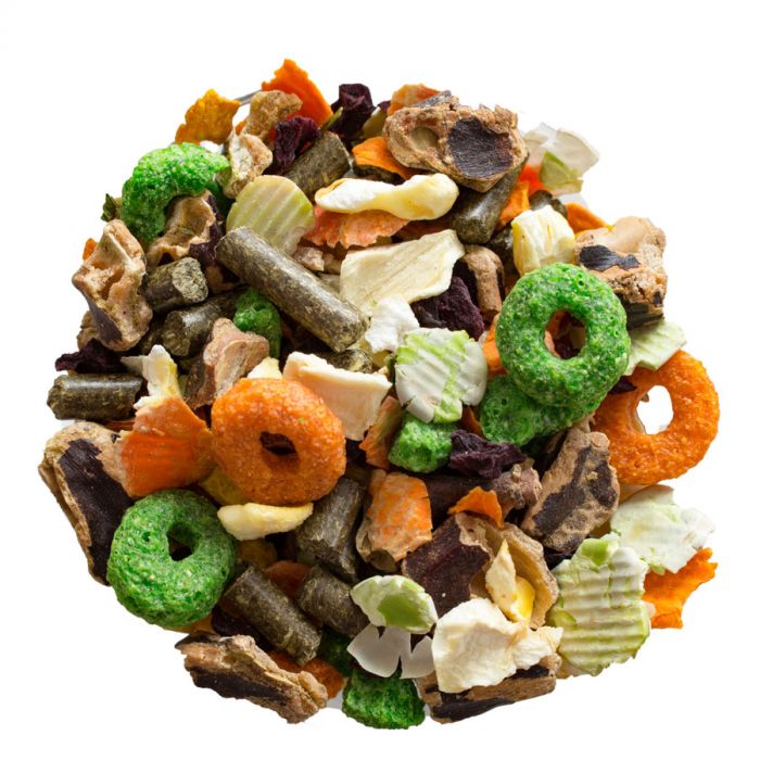 Ringos(Extrudat aus Mais, Sonnenblumenöl), Grünmehl-Pellets m. Vitaminen, Johannisbrot, Puffmais, Karottenflocken, Rote Beete-Würfel, Lauch, Erbsenflocken, Pastinakenwürfel / Kartoffeln