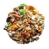 Weizen, Hafer, Hirse, Maiskroketten(Extrudat aus Mais, Maiskeimen, Maisstärke), Mais, Luzernepellets, Erbsen, Weizenflocken, Buchweizen, Erbsenflocken, Haferflocken, Johannisbrot, Sonnenblumenkerne, Erdnüsse geschält, Maisflocken, Karottenwürfel, Gammarus, Haferkerne mit Vitaminen