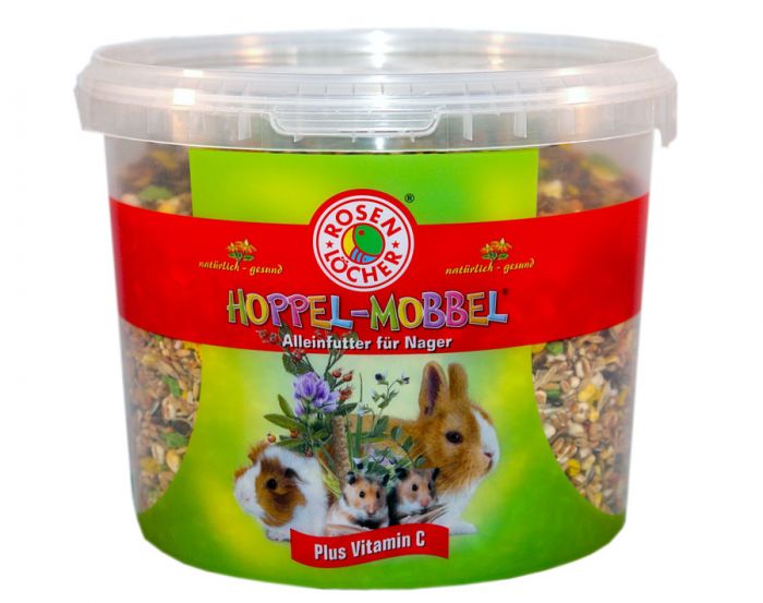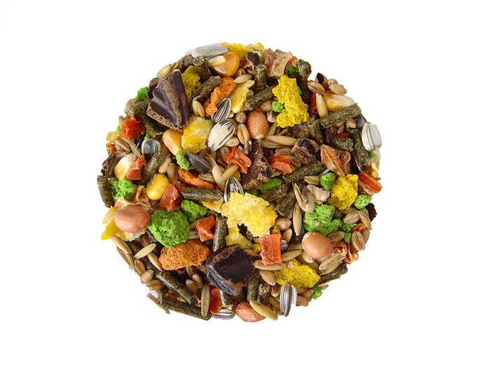 Luzernepellets, Weizen, Hafer, Mais, Maiskroketten(Extrudat aus Mais, Maiskeimen, Maisstärke), Johannisbrot, Maisflocken, Sonnenblumenkerne, Erdnüsse geschält, Karottenwürfel, Luzernepellets mit Vitamin C, Puffweizen