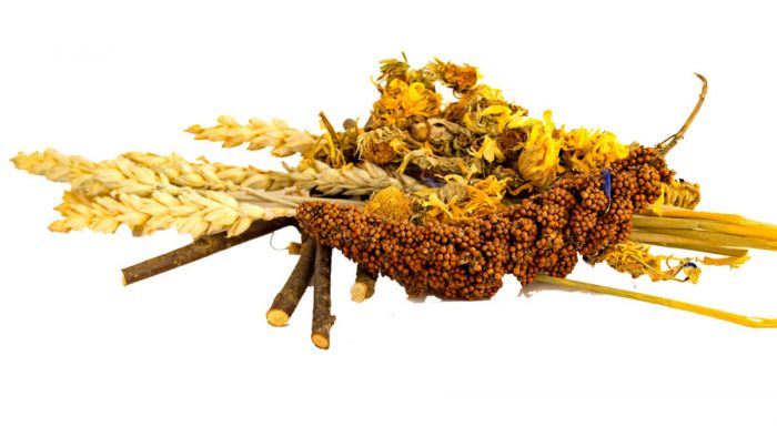 Weizen- u.Haferähren, Rosenblüten, Ringelblumenblüten,Topinambur, Haselnusszweige