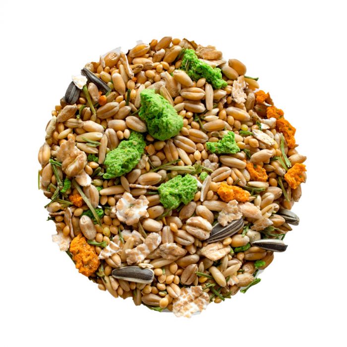Hirse, Weizen, Petersilienstiele, Maiskroketten(Extrudat aus Mais, Maiskeimen, Maisstärke), Haferkerne, Puffweizen, Weizenflocken, Kanariensaat, Sonnenblumenkerne