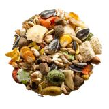 Weizen ,Fleischkroketten, Mais ,Hafer ,Maisflocken, (Extrudat aus Mais,Maiskeimen), Luzerne, Sonnenblumenöl, rote Beete), Erbsenflocken, Johannisbrot, Puffweizen, Leinsaat, Weizenflocken, Haferecken, Bananenchips, Karottenscheiben, Gammariden, Erdnüsse geschält, Kürbiskerne, Haferkerne mit Vitaminen
