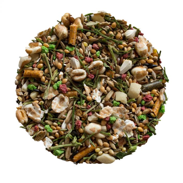 Hirse, Kanariensaat, Haferkerne, Lein, Wildsaaten, Karottenpellets, Weizenflocken, Japanhirse, Nigersaat, Petersilienstiele, Kardisaat, Biskuit rot/ grün, Erdnüsse geschält, Puffweizen, Haferkerne mit Vitaminen
