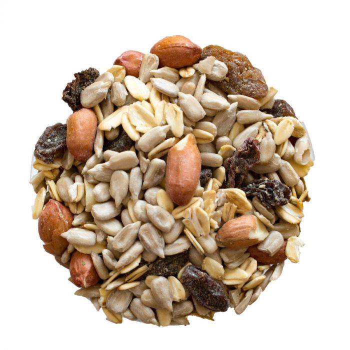 Erdnüsse geschält, Sonnenbumenkerne geschält, Weizenflocken, Hanf, Rosinen